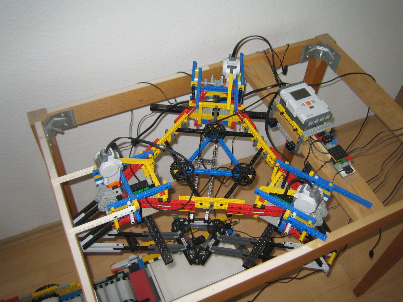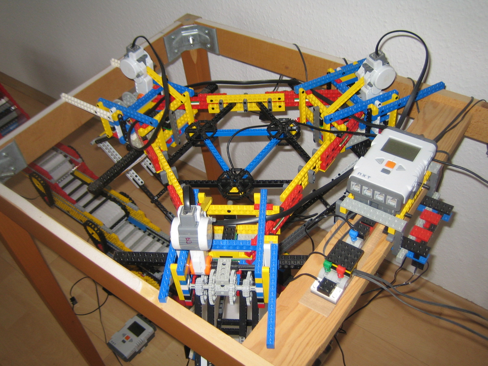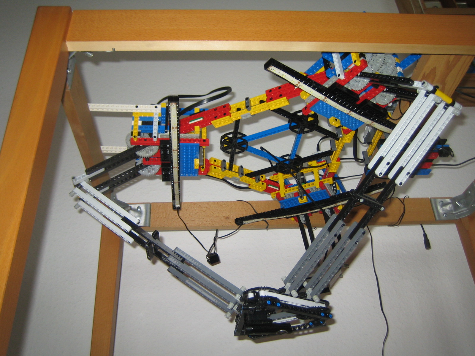 Here's another overhead view of the delta robot, showing the Mindstorms NXT controller, the cables going to each of the three NXT motors, and the thin black USB cable from the camera, coming up out of the centre, between the three blue Technic beams joined together in a triangle (and, incidentally, coming up with a design for a rigid framework for this whole delta robot, based on 60° angles, was an interesting challenge using Lego, which generally doesn't "do" equilateral triangular shapes at all well).