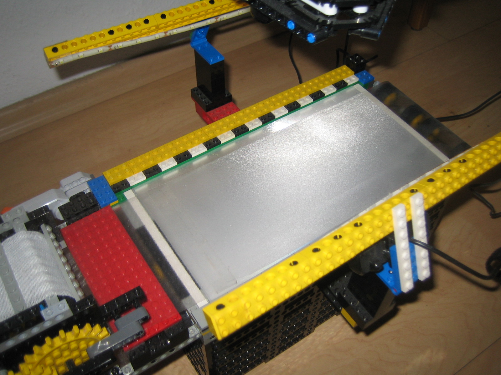 † a few parts are not Lego - the camera (a USB webcam), the conveyor belts (stretch bandage material), and the backlit viewing platform (an old laptop display backlight) - oh, and the table frame, of course.